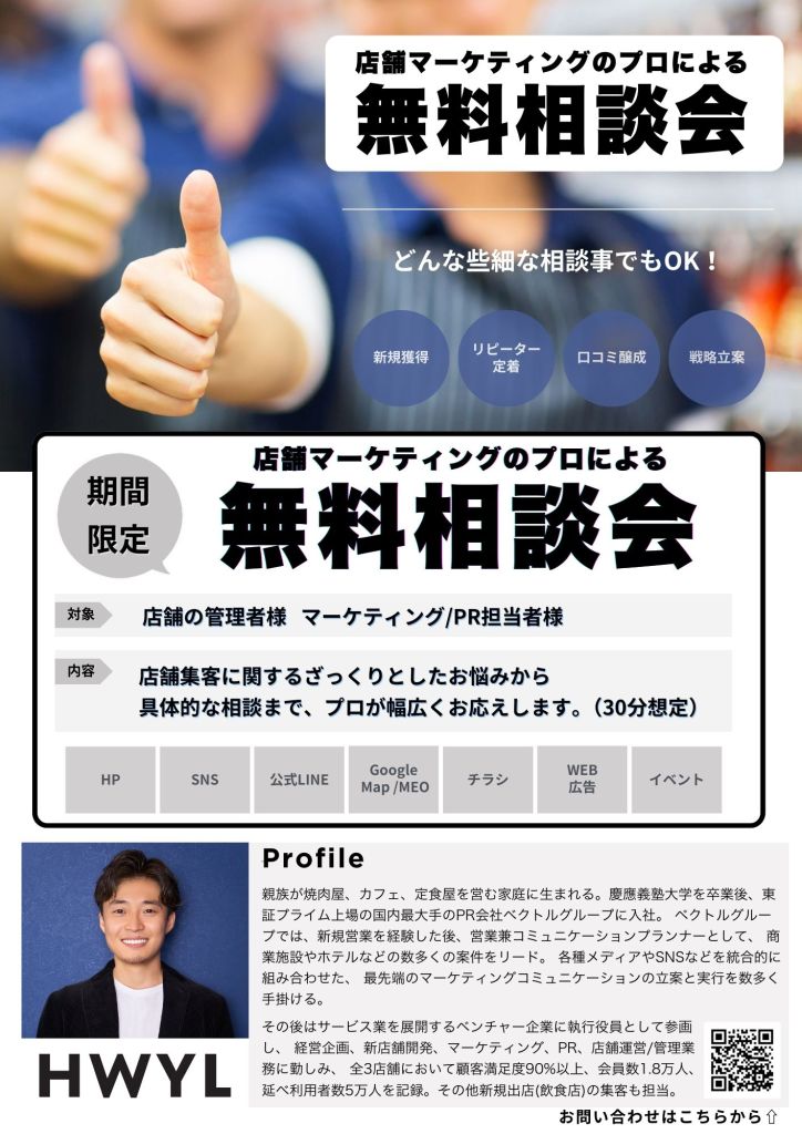 只今Hwylでは、店舗マーケティングのプロによる店舗集客に関する無料相談会を実施しております。